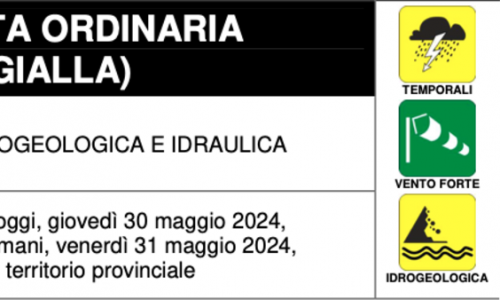 Dalle ore 16 di oggi, giovedì 30 maggio, alle ore 24 di domani, venerdì 31 maggio 2024, su tutto il territorio provinciale. Possibili criticità per temporali a livello idrogeologico e idraulico