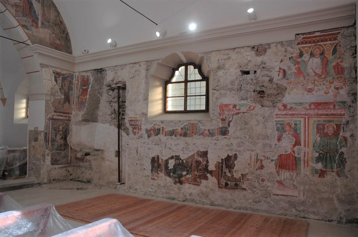 In particolare, sul prospetto ovest era stato ritrovato un frammento di intonaco dipinto raffigurante un San Cristoforo "“ ricordato nella Visita pastorale del 1695, quando i delegati vescovili ordinarono di "rifare, o cassare totalmente la pittura di San Christofforo" ubicata "nell"ingresso della chiesa" "“, mentre all"interno erano stati riscoperti frammenti di un"Ultima Cena e parte di una figura nimbata, riconducibile quest'ultima, per ragioni stilistiche, a una bottega di pittori itineranti di provenienza lombarda, nota con il nome convenzionale di Maestro di Sommacampagna, attiva in Trentino tra il 1366 e il 1380 circa.