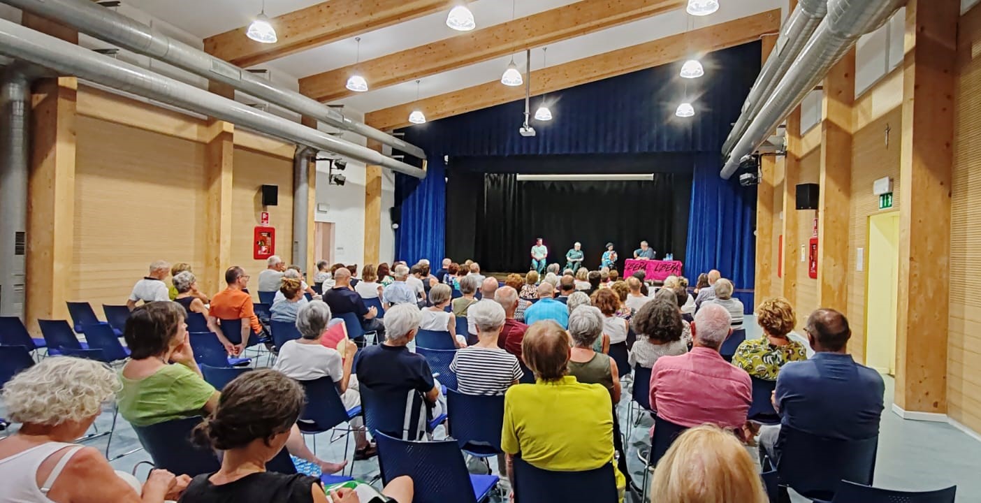 in un auditorium scolastico gremito nonostante il caldo e il clima